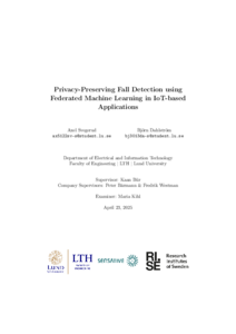 Each year, millions of elderly individuals suffer from fall incidents, leading to extensive hospital stays and, in the worst cases, fatal outcomes. Modern technologies can assist in detecting and responding to fall incidents more quickly, but many of these systems are based on centralized machine learning, where all data is collected and analyzed on a central server. This... (More) - Fall incidents are one of the most common causes of injuries and fatalities among the elderly. Modern technology can help detect falls, but this often comes at the expense of personal privacy. In our thesis, we explore how federated machine learning can be used to detect falls without sharing any raw motion data from users’ devices, thereby protecting personal privacy.